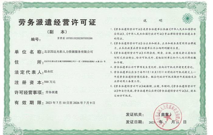 北京市从事劳务派遣服务的企业之一。自成立至今,公司以全面的服务资质,服务流程和使劳务派遣管理服务模式不断创新和提升的事业理念,从而铸就了公司良好的品牌优势, 使公司能够始终关注客户的需求,并使管理和服务流程更加明晰,使客户真正感受到了四达派遣的快捷。